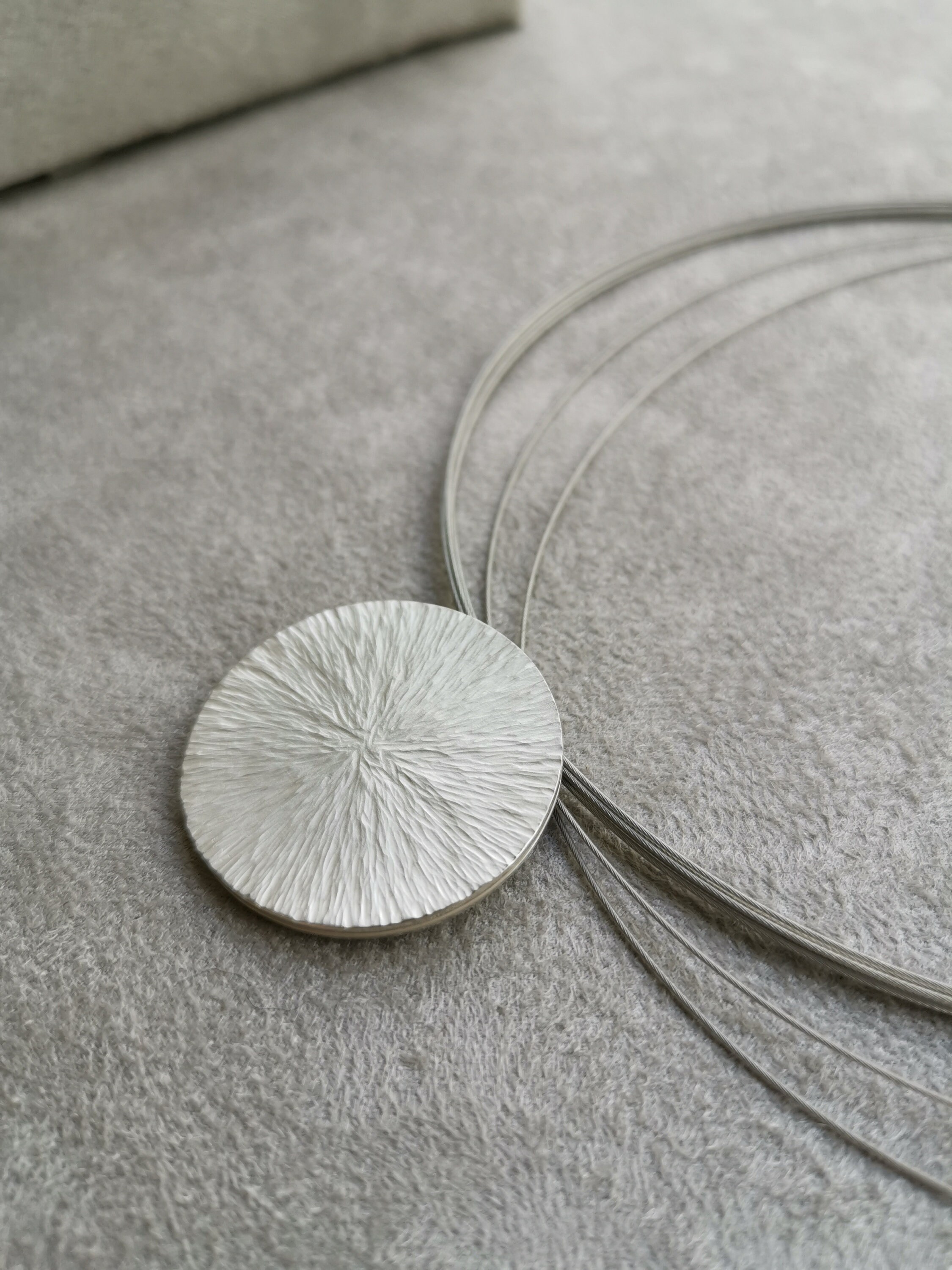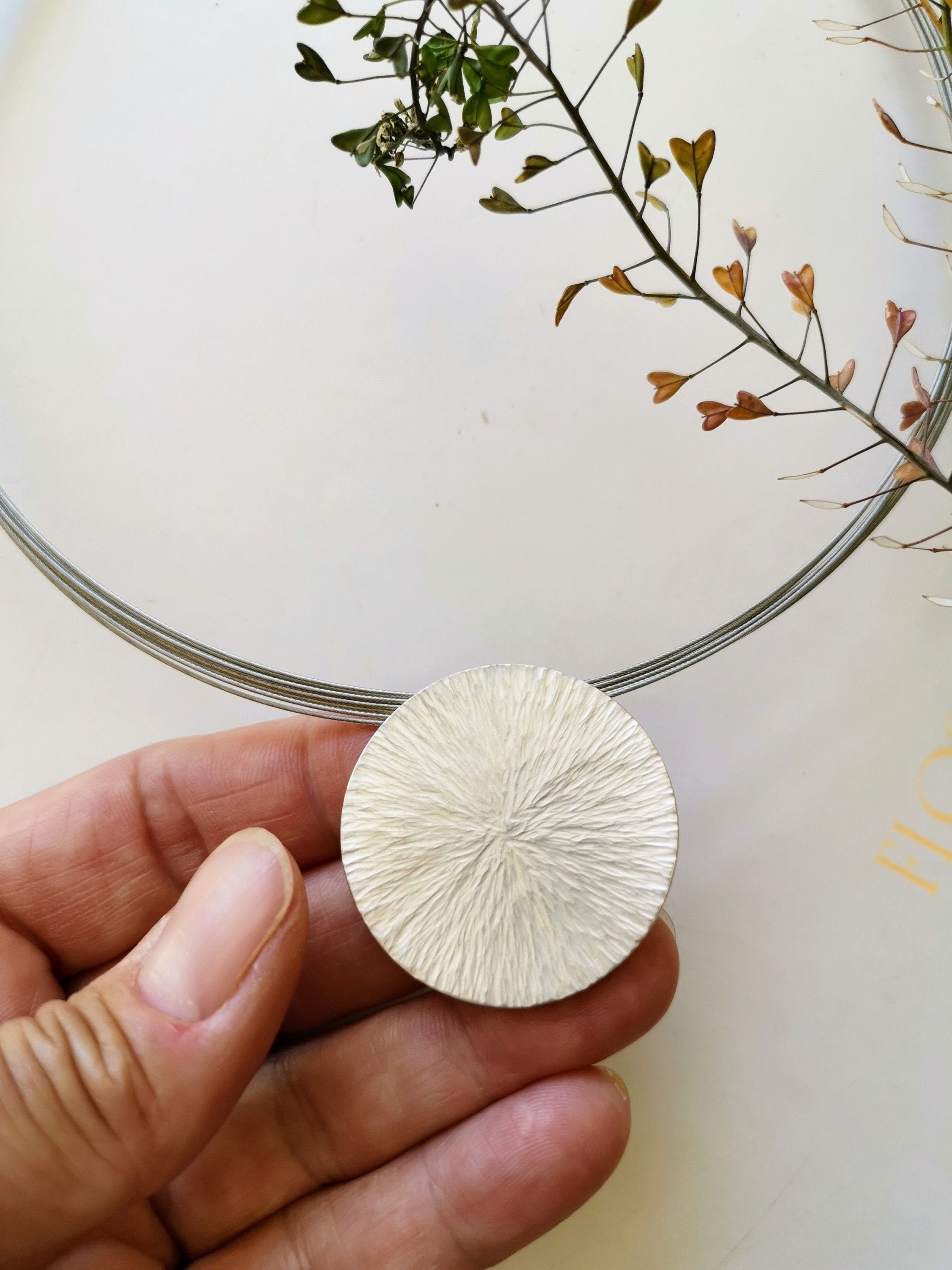 A heavy round disc pendant, hammered on both sides, made in solid silver.