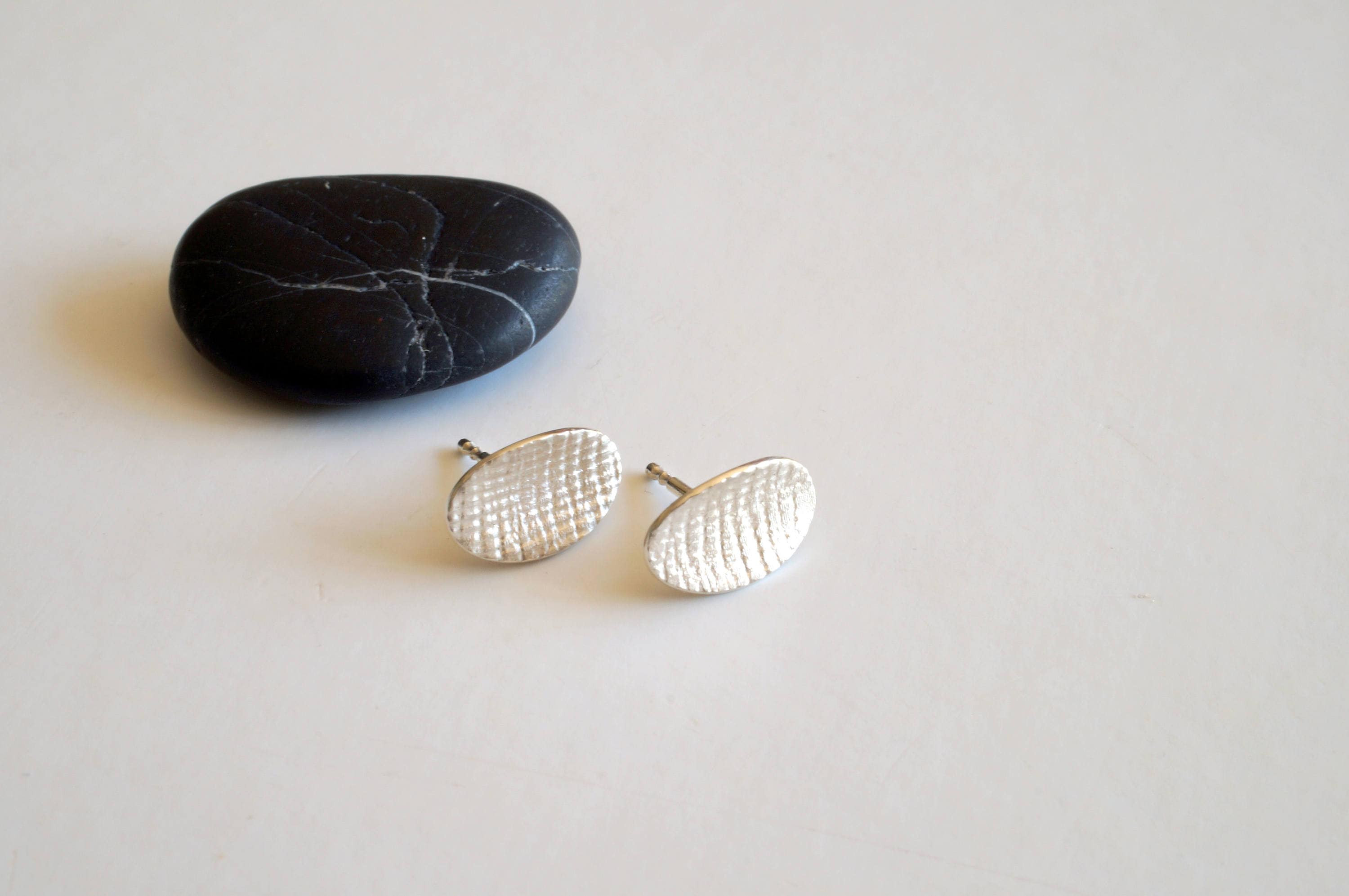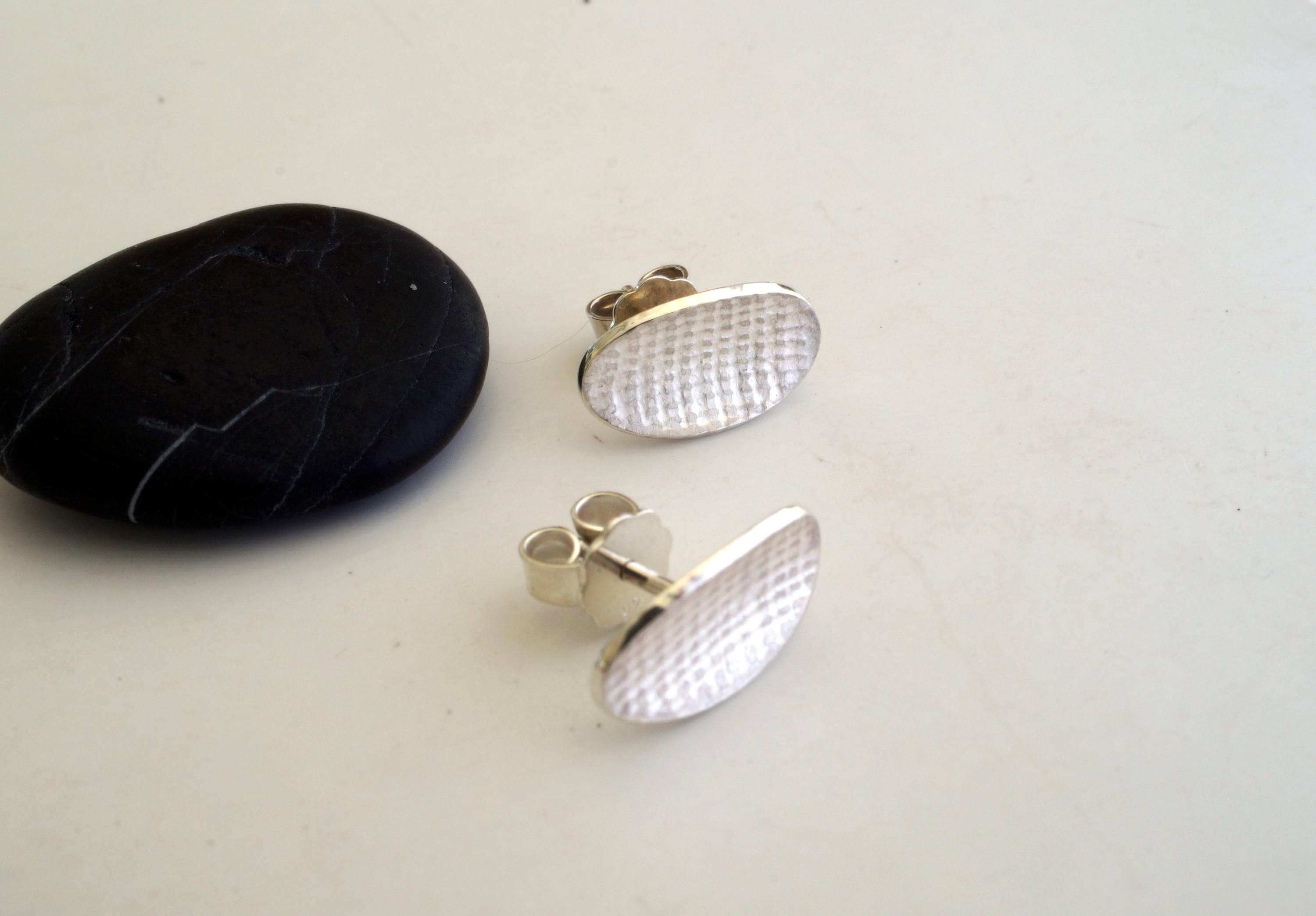 These pretty little oval ear studs are easy to wear every day.  A simple design with a linen texture. The oval is slightly domed with polished edges.