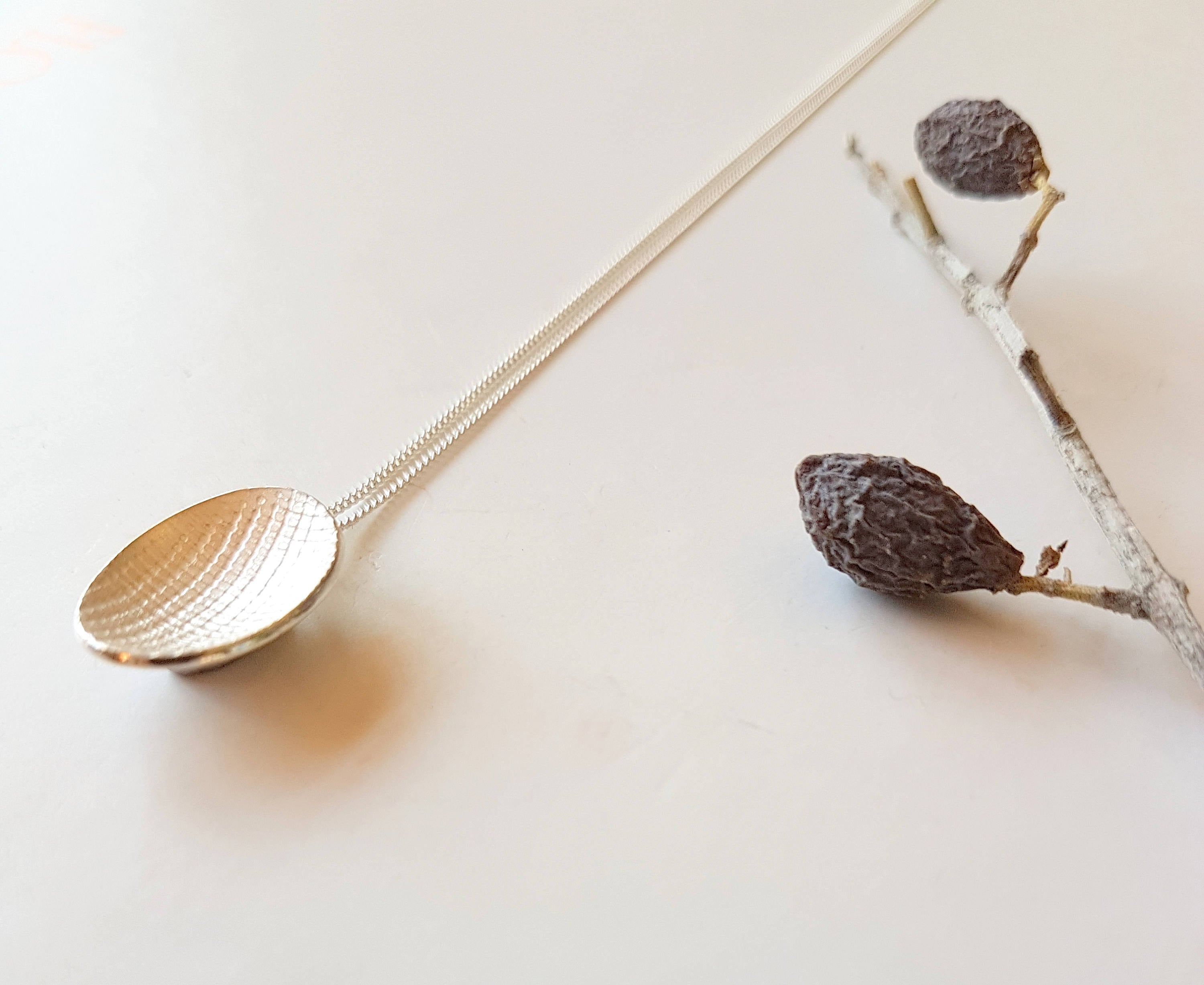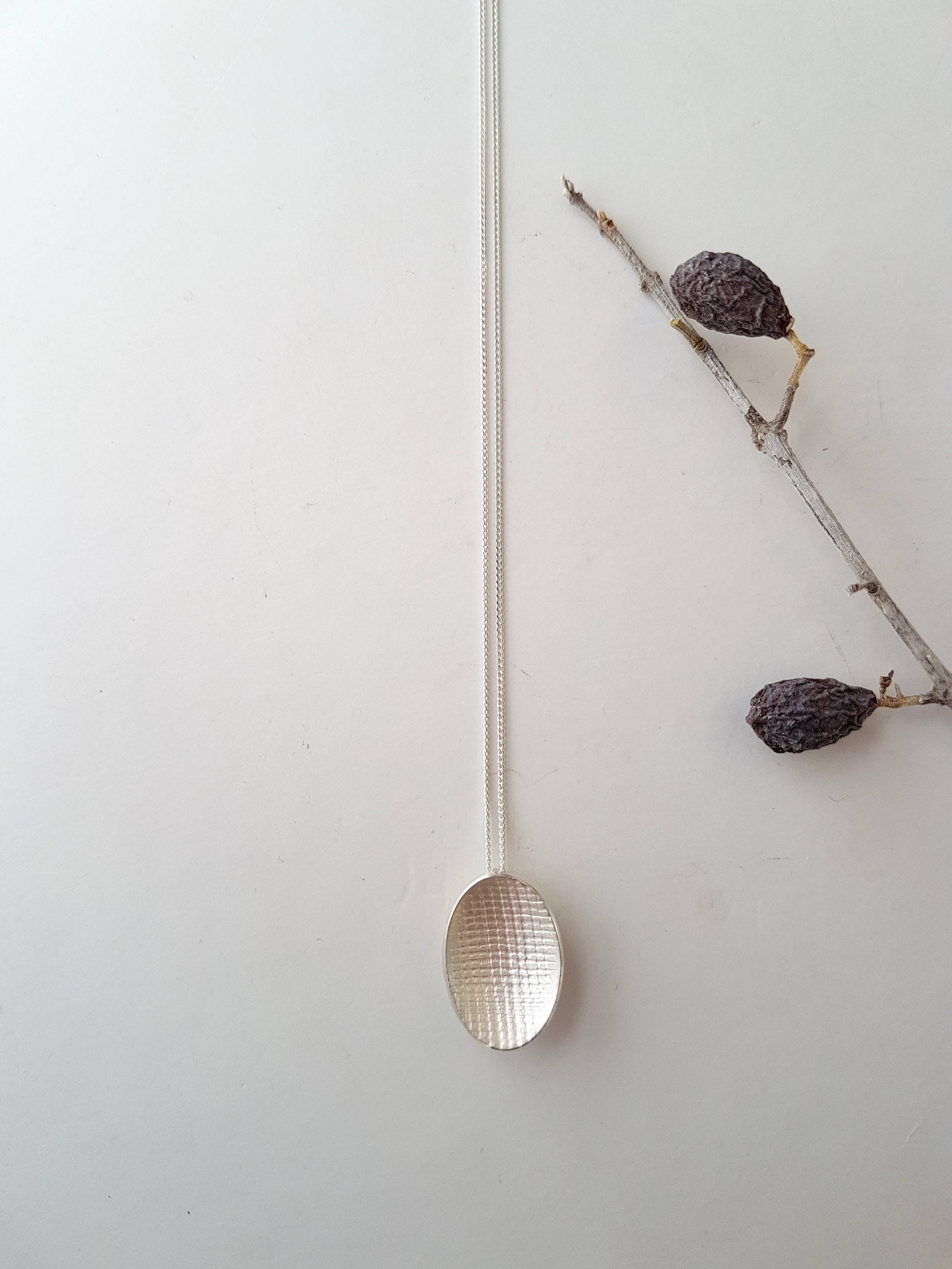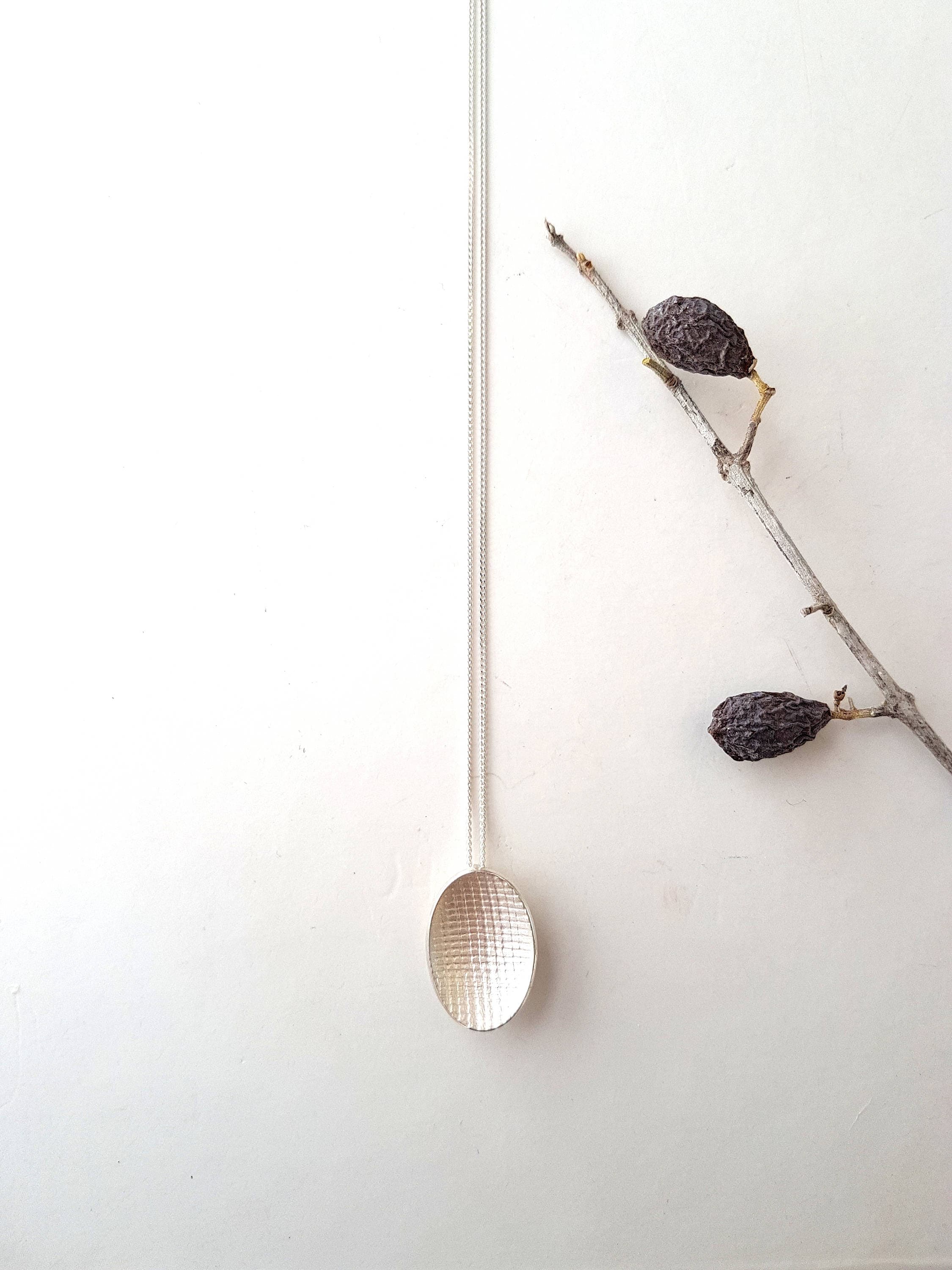 Minimalist and delicate necklace to be worn alone or as layering necklace. Handmade out of a slightly domed oval with a linen texture on both sides. The center is mat white with highly polished edges to contrast and accentuate.