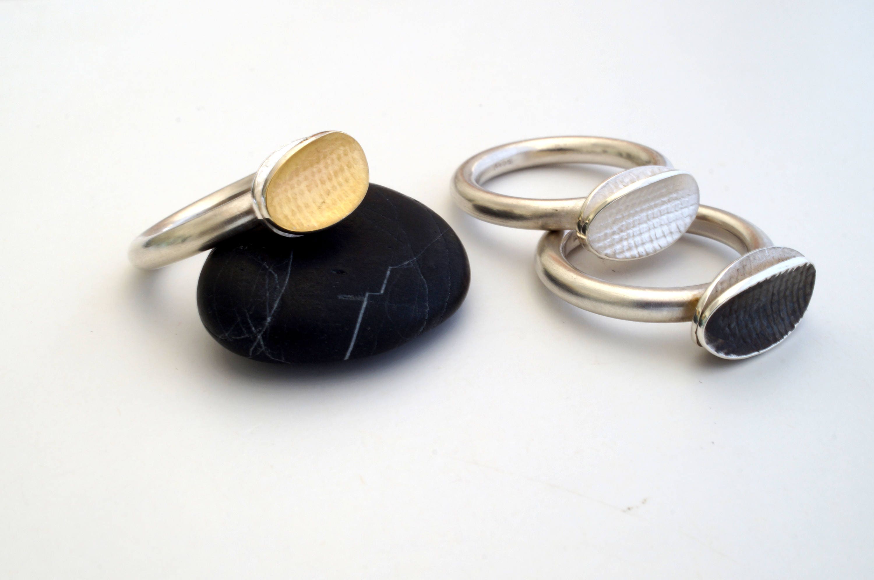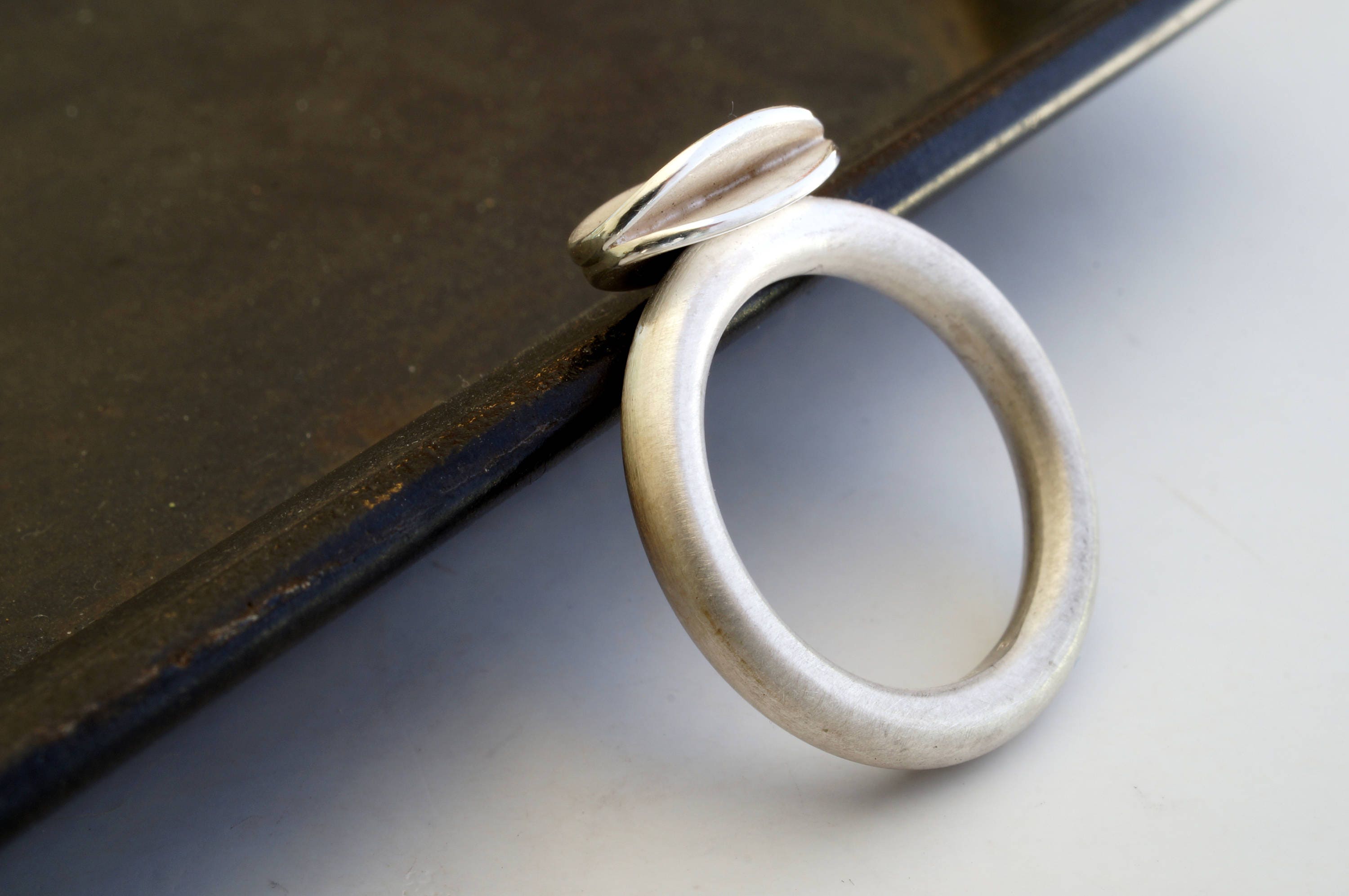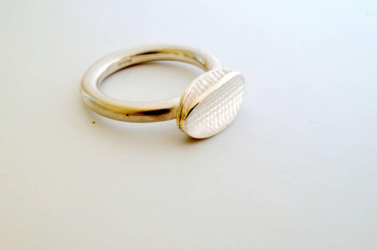 A solid silver band with with a concave oval top, slightly textured in different finishes.