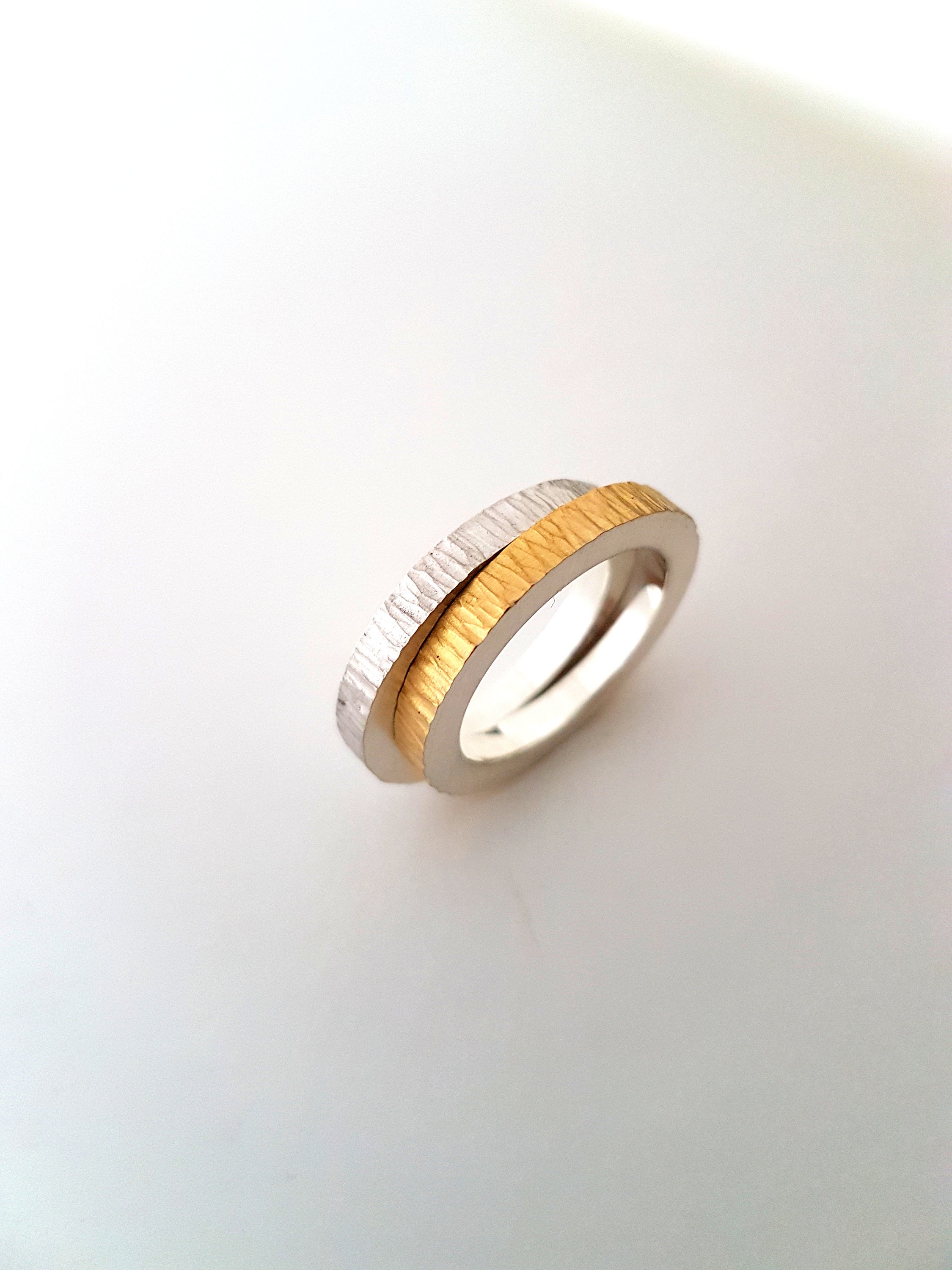 Chunky spinner ring made from solid silver; consisting of two rings that freely spin around but do not come apart. This model has a 2mm polished ring that freely spins around the textured band. The inside is highly polished and slightly domed for extra comfort and the outside has a satin finish.
