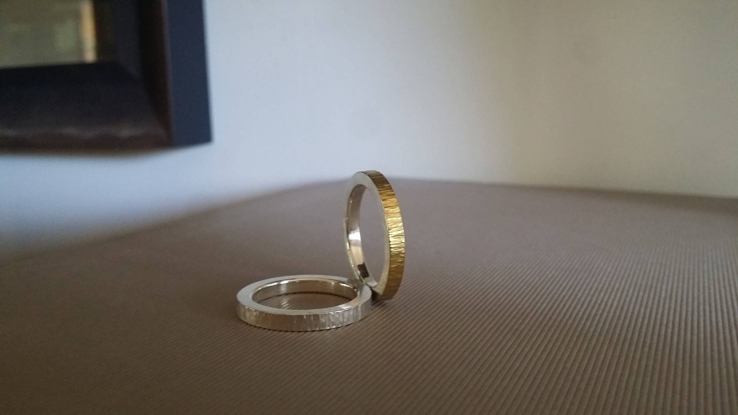 Chunky spinner ring made from solid silver; consisting of two rings that freely spin around but do not come apart. This model has a 2mm polished ring that freely spins around the textured band. The inside is highly polished and slightly domed for extra comfort and the outside has a satin finish.